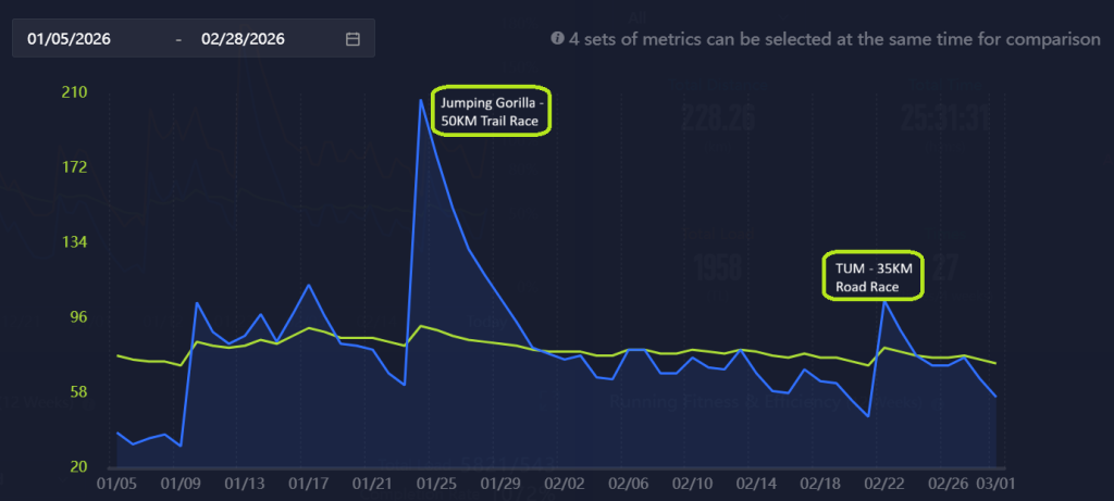 I had planned to run the TUM 35K race on February 22nd. However, I made sure not to waste time tapering for it and treated it as a hard long run at the end of my fifth-month peak week. The race went well, though I must admit I pushed a little extra toward the end. No regrets, though—I enjoyed every step and finished strong, and fully spent.